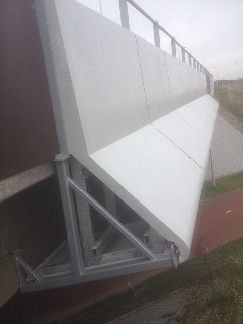 范布克尔集团(Van Boekel Group)和BeConcrete在荷兰的阿默斯福特(Amersfoort)天桥。 侧面板由A1制成,带有EPS泡沫芯。现在每块板的重量为150公斤,如果在混凝土中的重量是原来的十倍,则在此项目上总共可节省130.000公斤。